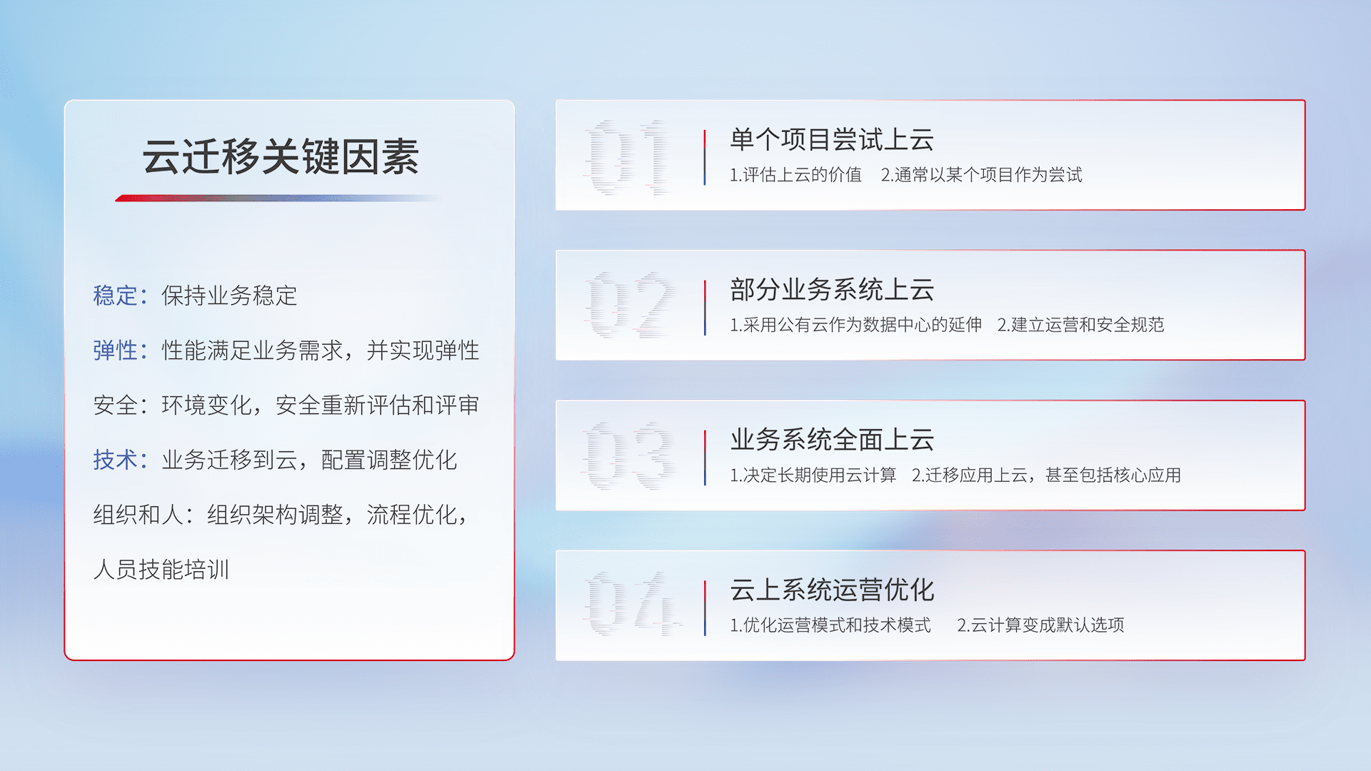 结合实际业务,,,,从规划设计、、、云平台选型、、云原生改造、、、、数据迁移、、、、集成交付,,,迁移全过程为客户识别最佳上云路径,,,,做好风险识别管理,,设计网络架构、、、、身份权限、、、、安全审计合规、、、操作审计、、日志审计、、、监控告警策略、、、多站点容灾设计等,,,,对云上基础设施进行整体规划,,,提升IT治理水平,,,以满足弹性、、、高可用、、、、高性能的需求。。。